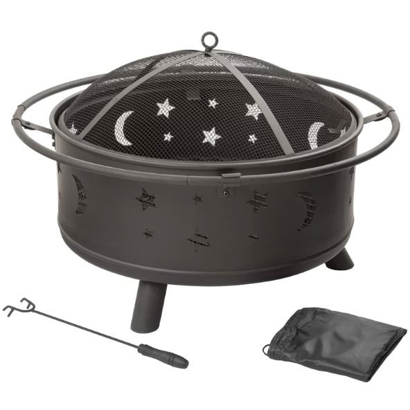 This Heavy Duty Steel Metal Wood Burning Fire Pit with Moon and Stars Cutouts is the perfect addition to any backyard patio or deck. The fire pit features star and moon cutouts throughout that make for a stunning effect at night when there is a fire going. Sturdy construction with a large fire bowl. The powder-coated steel frame resists rusting. Features a spark screen and protective screening across the cutouts to prevent sparks from flying. A safety ring encompasses the entire diameter of the fire pit and functions as a convenient handle for carrying. Includes spark screen, log poker, log grate, and a weather resistant cover so you have everything you need.